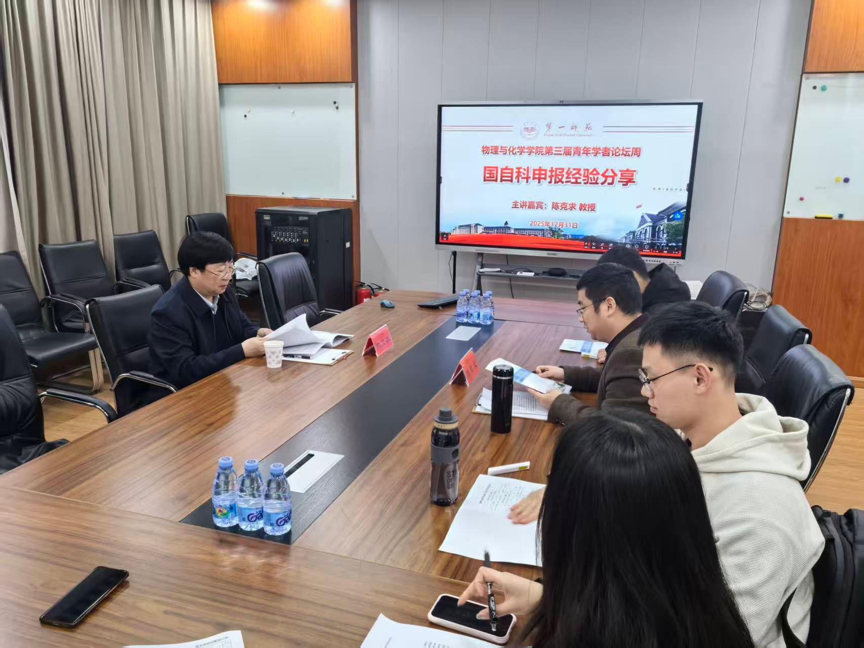 12月31日,论坛周进入了计算组与量子组的专题交流指导环节。在玉衡北302室,陈克求教授先分享了计算方向的国自科申报经验,随后,廖举建、程嘉薪、陈长龙等青年教师依次进行了国自科选题报告,陈克求教授为报告人提供了专业指导与点评。与此同时,玉衡楼406室也举行了量子组的专题报告,匡乐满教授带来了量子方向国自科申报经验的精彩分享,刘宇鸿、杨亚、左云兰等教师也展示了他们的选题报告,经过匡乐满教授的点评和指导,青年教师们获益匪浅,现场气氛热烈,学术氛围浓厚。