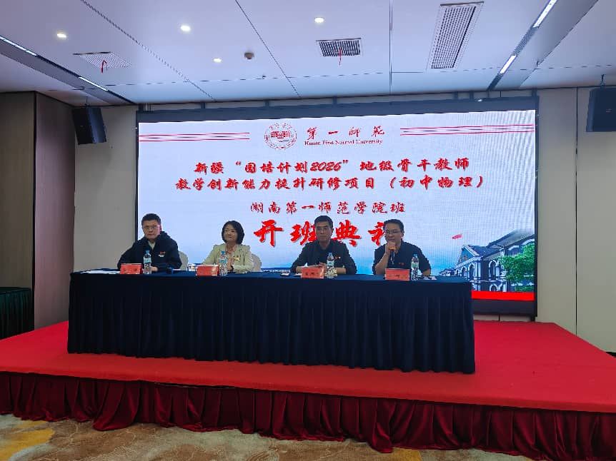 的培训团队相聚长沙。4月15日上午,新疆“国培计划(2026)”地级骨干教师教学创新能力提升研修(初中物理)在长沙梅溪湖豪生酒店隆重开班。开班典礼由班主任刘洁文老师主持。在庄严的国歌声中,典礼正式拉开序幕。